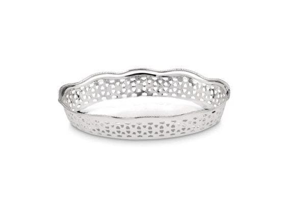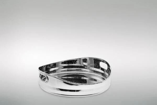 Großes, rundes Galerie-Tablett aus versilbertem Messing. Das Tablett hat eine Höhe von 5,0 cm und einen Durchmesser von 26,5 cm.