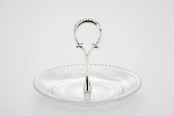 Konfektschale mit verziertem Glas und versilberten, anlaufgeschützen Griff. Die Höhe der Konfektschale ist 10,5 cm und der Durchmesser 15 cm.