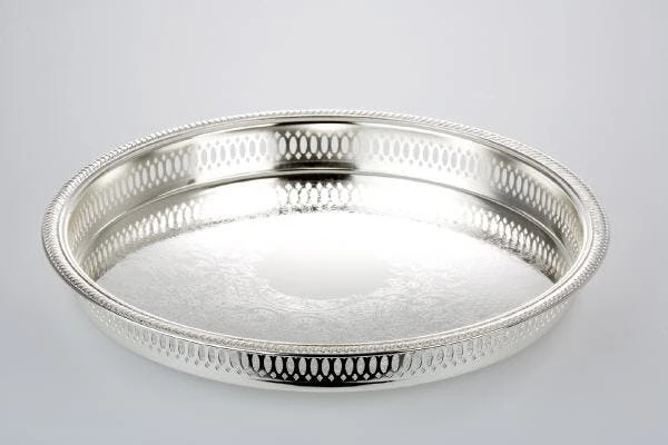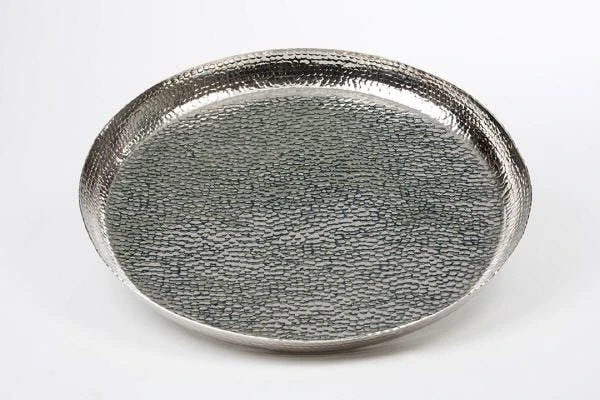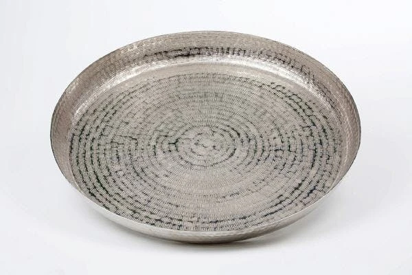 Tablett aus Aluminium vernickelt.Der Durchmesser ist 57,0 cm und die Höhe ist 5,0 cm.
