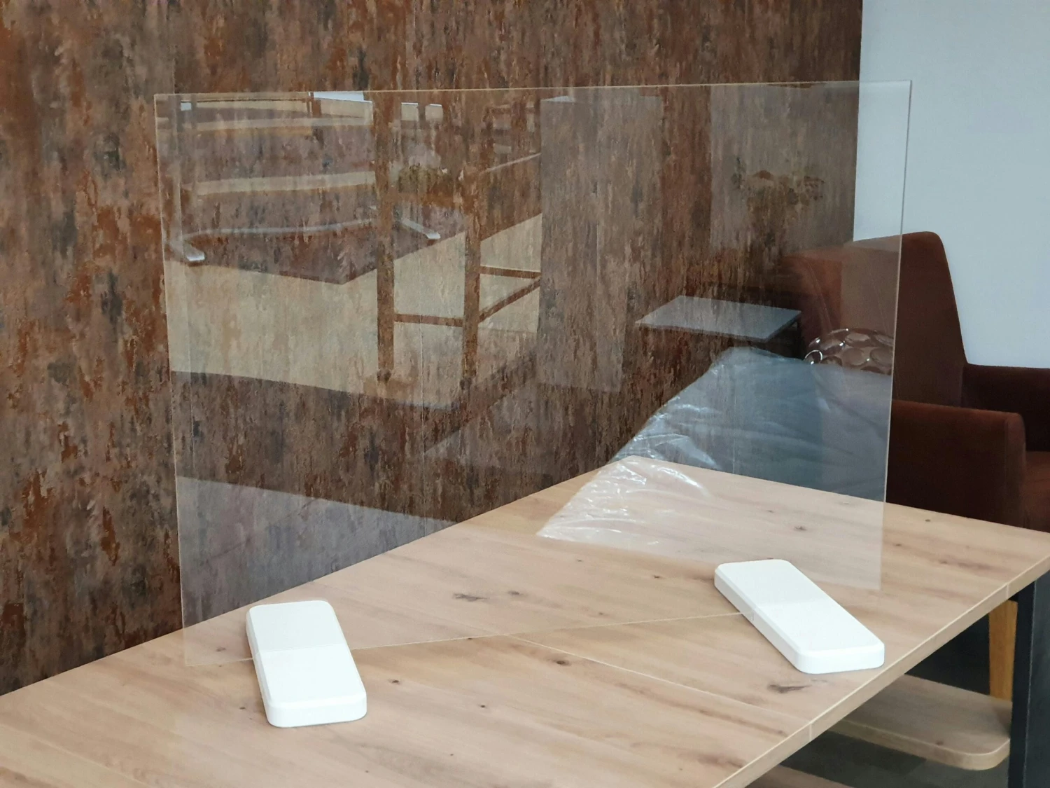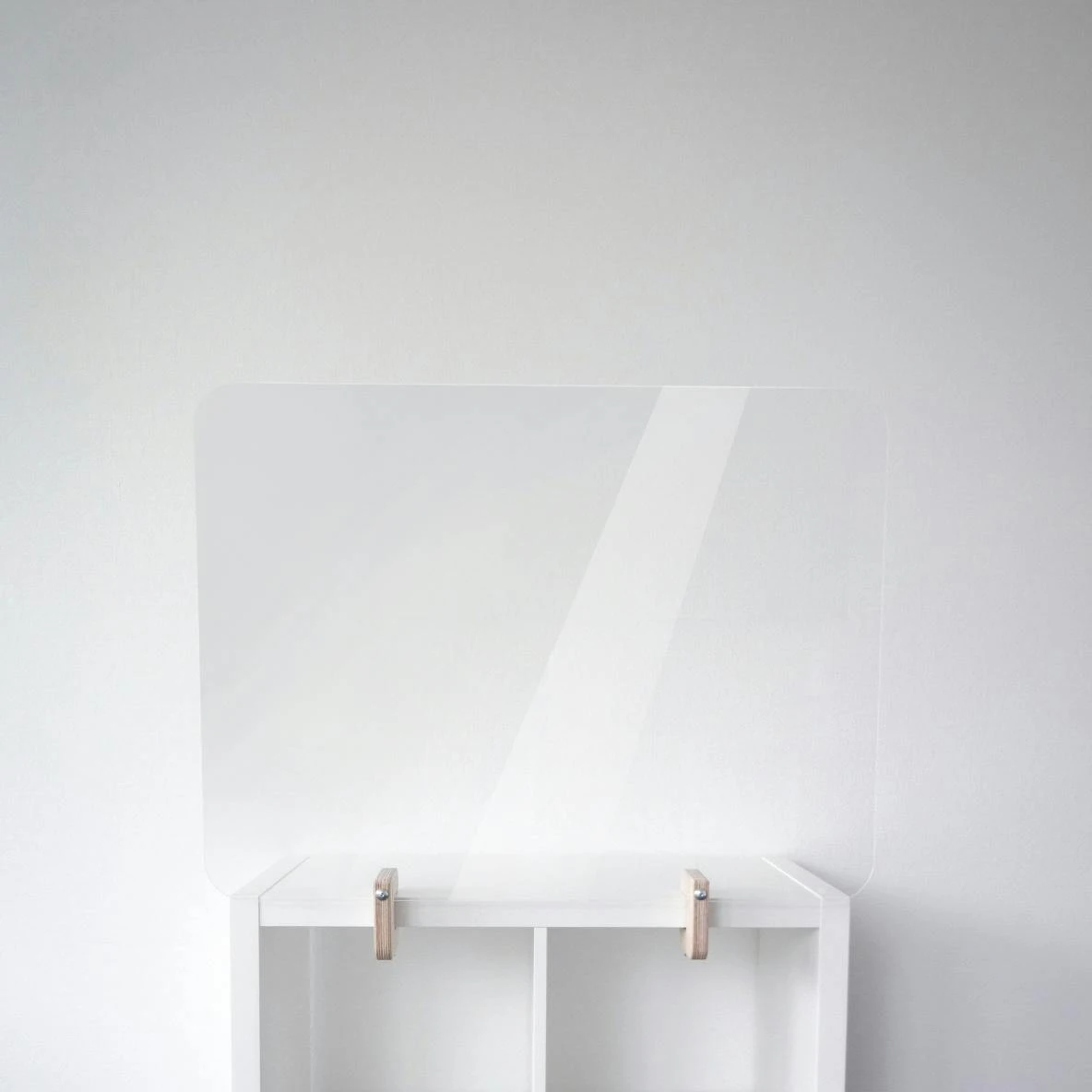 Hochwertiger Infektionsschutz aus 4mm Kunststoffglas und zwei Holzklemmen.